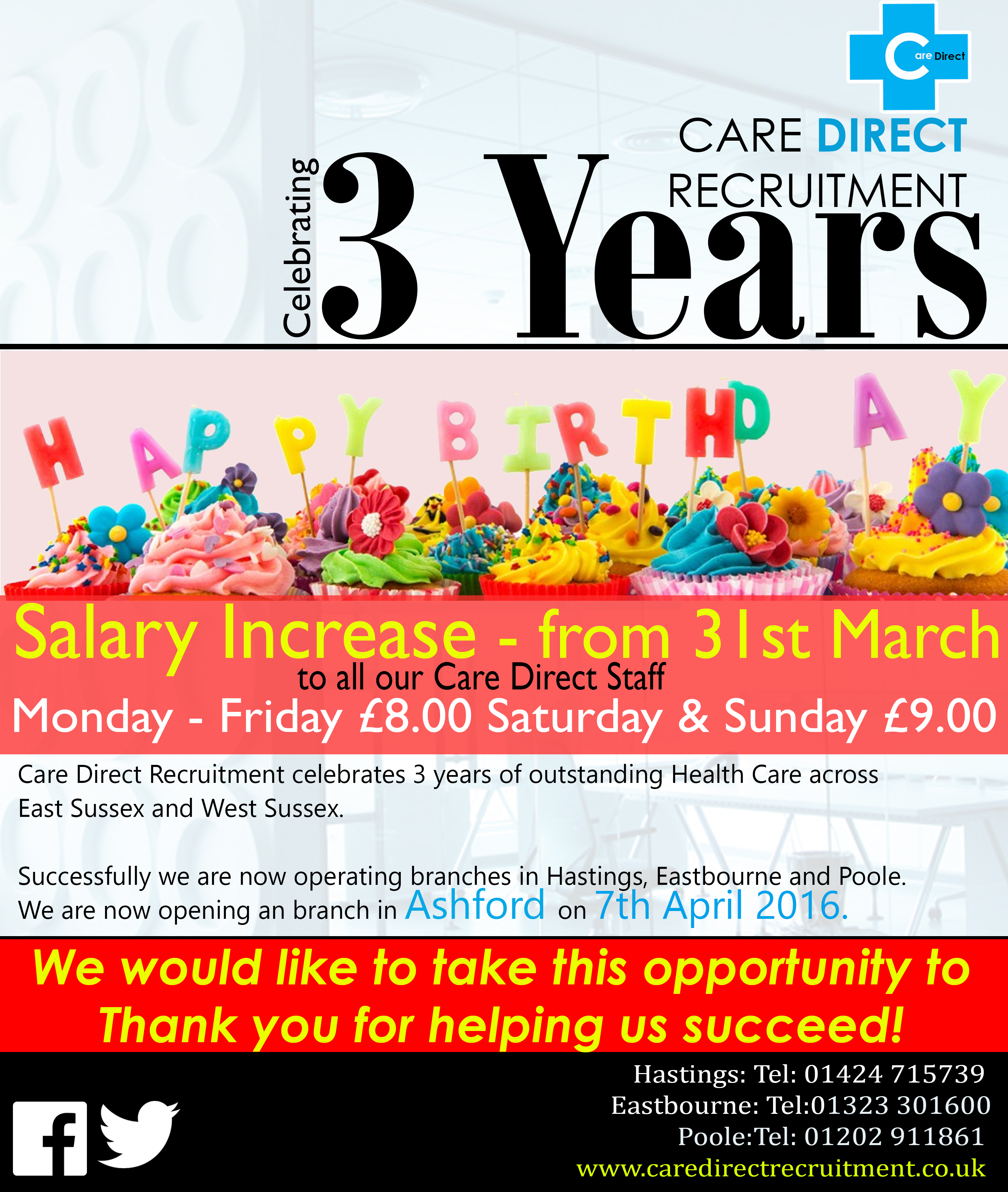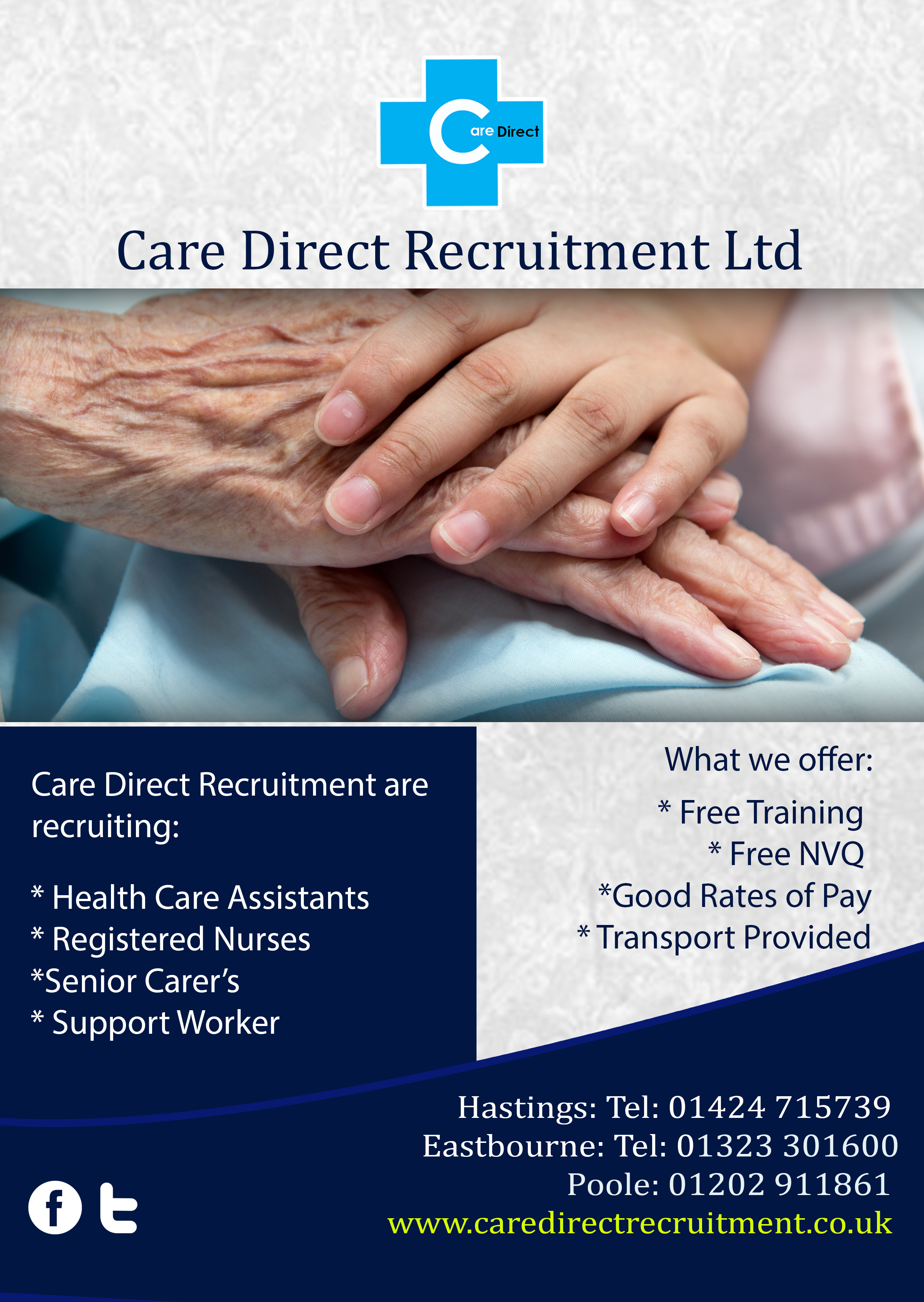 Care Direct Recruitment Ltd are recruiting Health Care Assistants, Support Workers, Registered Nurses and Senior Carers. We offer: Free NVQ Training Free Training Good Rates of pay If you are interested in joining with Care Direct and want full time/part time work, then why not come an register with us!! Hastings: 01424 715739 Eastbourne: 01323